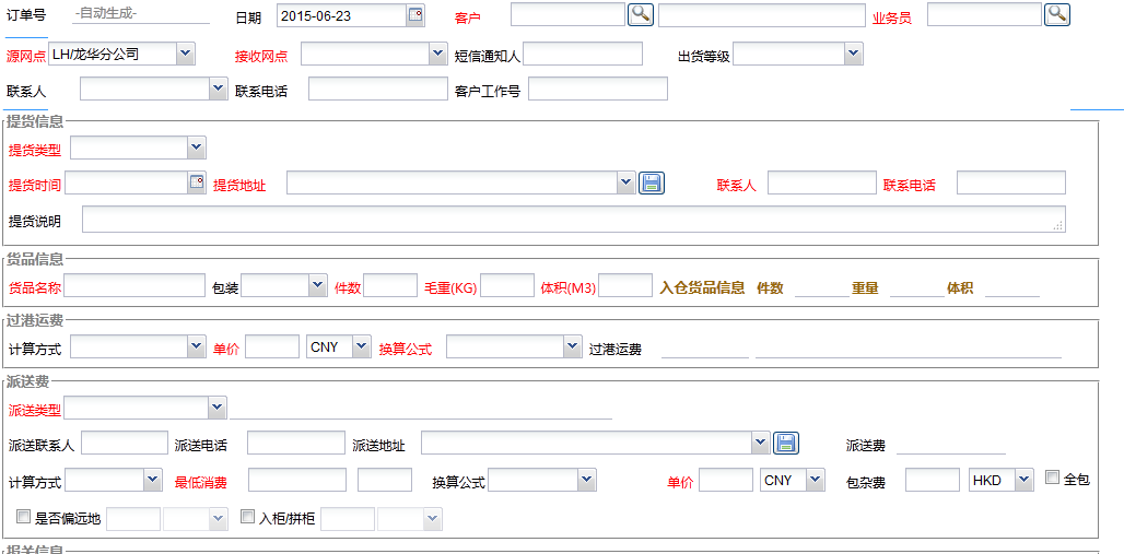 接下來的事,就是提貨費輸入了,結款方式選擇,大體上【中港物流】快件單就完成了。提交訂單,中港快件單就生成了。如果是中港一般貿易出口單在快件單的基礎上保存好頁面,增加報關方式這一欄當中填好報關抬頭以及報關資料份數和寄送還是隨貨到報關行。保存好這欄提交提單一般貿易單也生成了。下面是我們erp系統空白頁面。